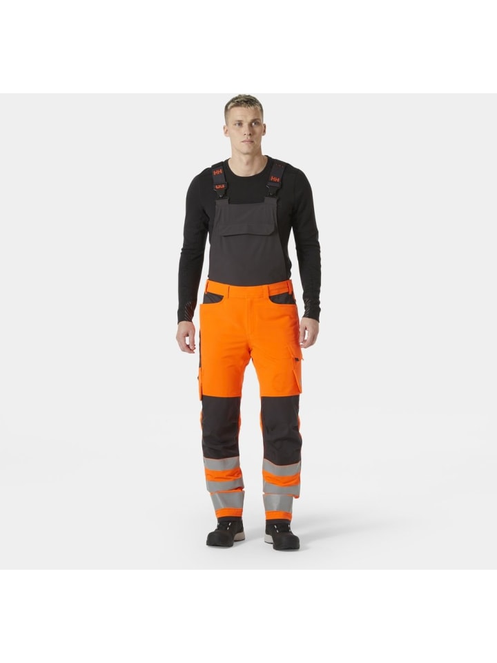 EN ISO 20471:2013:2019: Только оранжевый. Нитки AMANN. Молния YKK. Армирующая ткань Cordura. Ткань, растягивающаяся в 4 направлениях. Нагрудный карман с застежкой-липучкой. Задний карман с застежкой-липучкой. Регулируемая талия. Эластичные подтяжки. Широкая петля для ремня по центру спины для дополнительной устойчивости и прочности. Вставка в шаговом шве для большей свободы движений. Набедренный карман с застежкой-липучкой и несколькими отделениями. Карман для линейки из армированной ткани Cordura. Металлические кнопки с пластиковым покрытием. Артикулированные колени для оптимальной подвижности. Усиления из ткани Cordura на коленях и голенях. Положение наколенника можно отрегулировать на 5 см для оптимальной подвижности. Карманы для защиты коленей с внешним доступом. Возможность увеличения длины штанины на 5 см. Петля для удостоверения личности. Основная ткань: 92% полиэстер, 8% эластан. 240 г/м², Вторичная основная ткань: 94% полиамид, 6% эластан - 244 г/м², Третья ткань: 75% полиэстер, 25% хлопок - 245 г/м², Усиление: 100% полиамид - 210 г/м²
