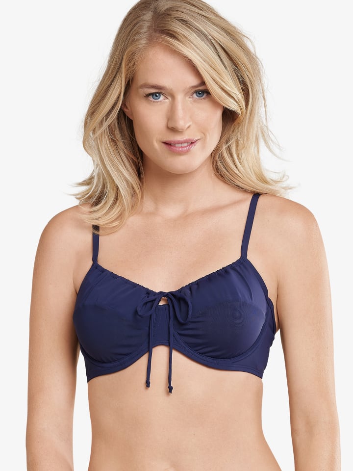 Шикарный верх бикини на косточках из коллекции купальников SCHIESSER Aqua \u0026 Match\". Привлекательные чашечки с женственными сборками и бантом на центральной панели. Подкладка из сетки Power Mesh обеспечивает мягкую поддержку, а регулируемые многофункциональные бретели гарантируют высокий комфорт при ношении. Небольшой серебристый логотип Aqua служит визуальным элементом. Также доступны большие размеры до чашки F. Изготовлены из особо сохраняющей форму, идеально облегающей и удобной трикотажной ткани.