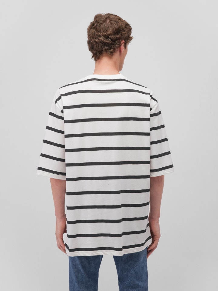 Классическая полосатая футболка свободного кроя с круглым вырезом.