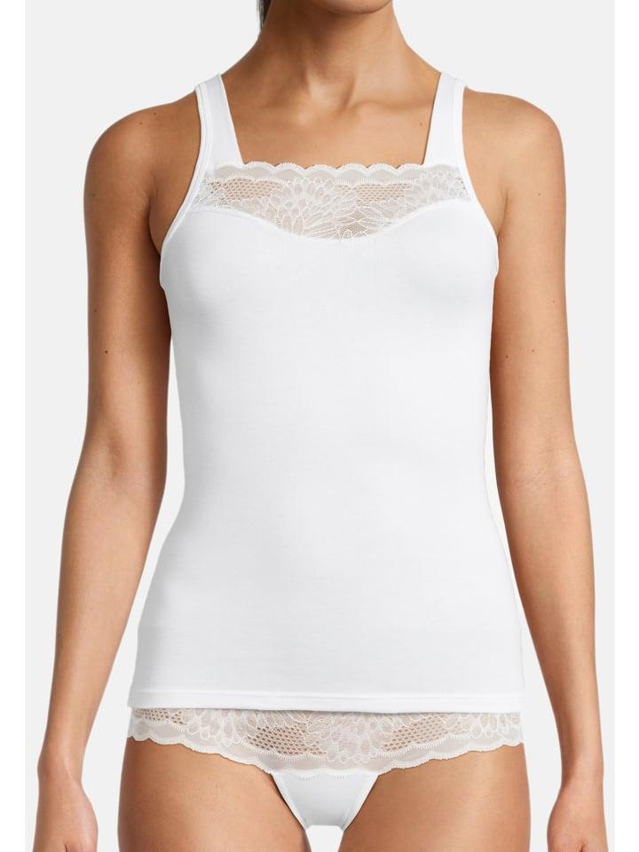 Эта майка сочетает в себе максимальный комфорт и элегантный вид. Стабильный по размерам материал обеспечивает идеальную посадку и приятно прилегает к коже, а мягкая ткань дарит ощущение особого комфорта. Благодаря бесшовной обработке по бокам нет раздражающих швов, которые могли бы врезаться или давить. Элегантная отделка из высококачественного кружева на вырезе горловины подчеркивает женственность и придает дизайну стильный вид. - Высококачественная кружевная отделка