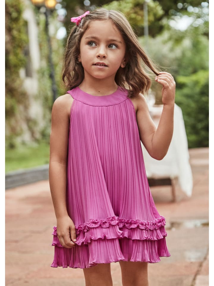 Плиссированное платье для девочек Mayoral — это элегантное платье без рукавов, которое идеально подойдет для особых случаев, таких как свадьбы или семейные торжества. Изделие изготовлено из тонкой плиссированной ткани с подкладкой из смеси полиэстера и хлопка, что делает его особенно удобным в носке. Платье имеет круглый вырез, широкий расклешенный разрез выше колена и оборку по подолу. Бант на шее стильно завершает дизайн. Это платье сочетает в себе функциональность с модным дизайном и обеспечивает высокий комфорт при ношении, идеально подходит для теплого времени года.