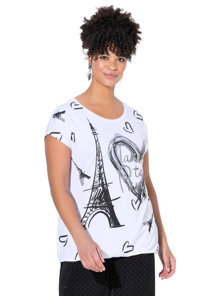 Футболка удобного кроя с принтом «Париж/сердце» и эластичным подолом — всегда комфортно. Круглый вырез, спущенная линия плеча, короткие рукава.