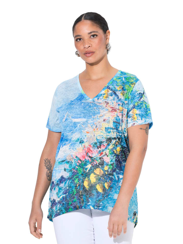 Футболка А-силуэта из мягкого выжженного трикотажа с декоративными стразами на итальянском принте. V-образный вырез, короткие рукава.