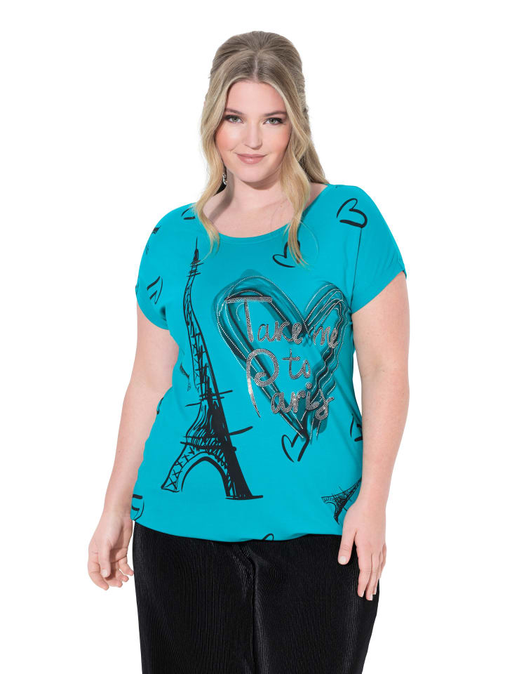 Футболка удобного кроя с принтом «Париж/сердце» и эластичным подолом — всегда комфортно. Круглый вырез, спущенная линия плеча, короткие рукава.