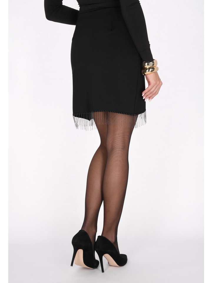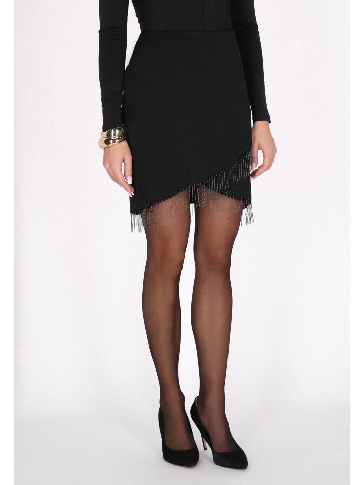 - Мини-юбка-обертка с высокой талией, бахромой из стразов и контрастной отделкой
