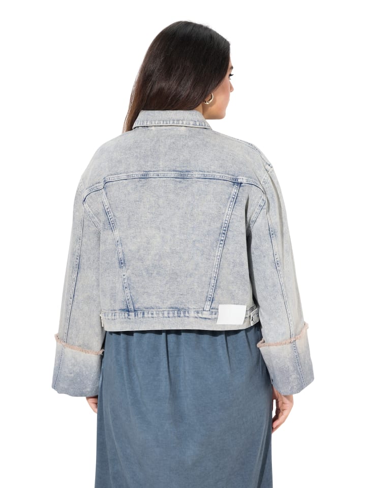 Джинсовая куртка, оригинальный крой, из предварительно выстиранного эластичного денима с отворотом на длинном рукаве. Воротник рубашки, металлические пуговицы, 4 кармана.
