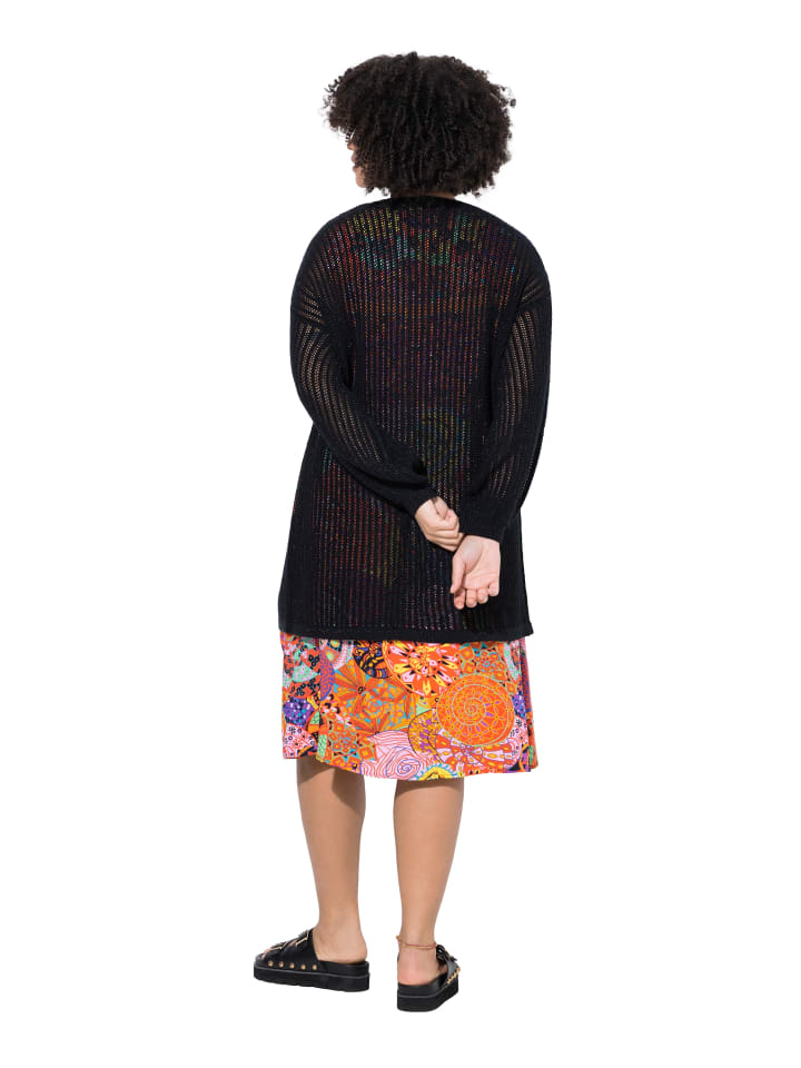 Кардиган свободного кроя, выполнен из мягкой ажурной вязки с блестящим эффектом. Повседневный открытый жакет с V-образным вырезом, спущенными плечами и длинными рукавами-фонариками с ребристыми манжетами.