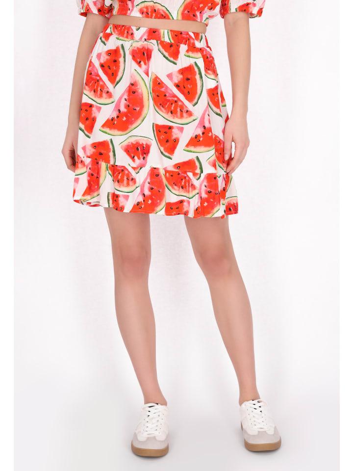 Откройте для себя эту модную юбку А-силуэта с длиной мини и обычным кроем. Высокая талия и игривые складки внизу добавляют ей молодежного очарования. Эластичный пояс обеспечивает комфорт, а тканый материал прекрасно сидит. Украшенная восхитительным принтом арбузов, эта повседневная юбка идеально подходит для создания удобных, но стильных образов из нашей коллекции Young Fashion.