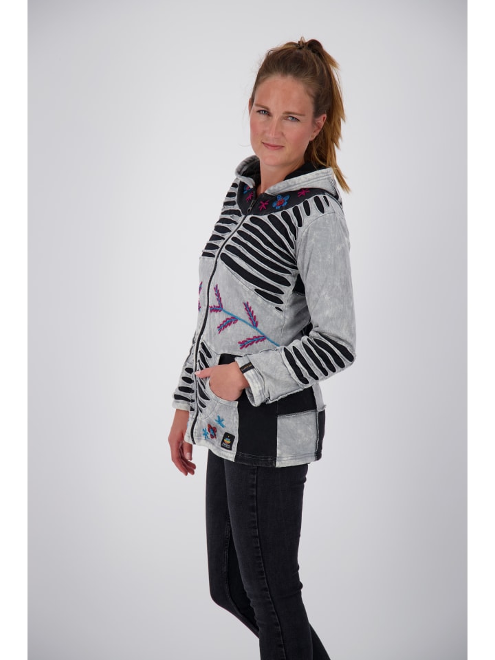 Дух Гималаев. Очень современная и необычная женская куртка в стиле пэчворк с капюшоном, выполненная из 100% хлопка с контрастными заплатками разных цветов, расположенными на серебристом фоне. Имеет слегка заниженную линию талии и более широкие расклешенные манжеты. Застежка-молния спереди и наклонные боковые карманы создают непринужденный и стильный образ. Необычная лоскутная мода для отдыха на природе «Дух Непала» — это не просто легендарный на первый взгляд стиль хиппи 1960-х годов, а скорее образ жизни, сочетающий толерантность и открытость с миролюбивым и жизнеутверждающим настроем, независимо от возраста. Эта индивидуальная одежда ручной работы поставляется нашими избранными партнерами в Непале и Индии. Вдохновение для наших коллекций мы черпаем из жизни людей, живущих в Гималаях. Использование отборных материалов, таких как 100% натуральная шерсть или высококачественный хлопок из регионов Непала и Индии, в сочетании с мягкой, пушистой флисовой подкладкой обеспечивает поддержку и защиту в любую погоду. Защита окружающей среды и устойчивое развитие являются нашими главными приоритетами при выборе сырья. Мы постоянно развиваем сферу использования натуральных волокон, в том числе и в нашей упаковке. При транспортировке наших товаров мы стараемся как можно больше перевозить морским или железнодорожным транспортом, а не самолетом, чтобы свести к минимуму выбросы CO2.