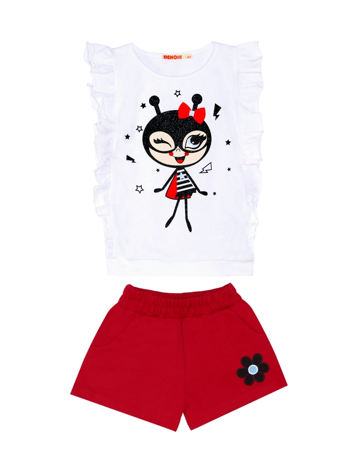 Комплект из 2-х предметов. Футболка с принтом божьей коровки. Оборки от плеча до талии. Красные шорты с боковыми карманами и цветочной аппликацией. Обычная посадка. Если вы растете, мы рекомендуем брать на размер больше. Вся продукция Denokids производится в соответствии с правилами безопасности детей.