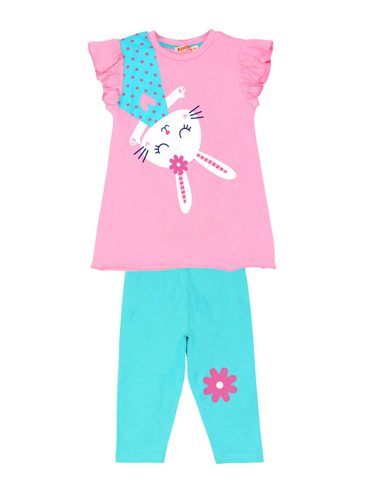 - 2 шт. Набор. Футболка с принтом кролика и оборками на плечах. Эластичные леггинсы бирюзового цвета с цветочным принтом.