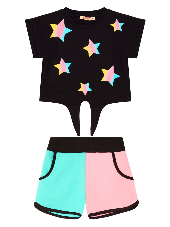 - 2 шт. Набор. Укороченная футболка с разноцветными звездами. Шорты с разноцветными штанинами и эластичным поясом.