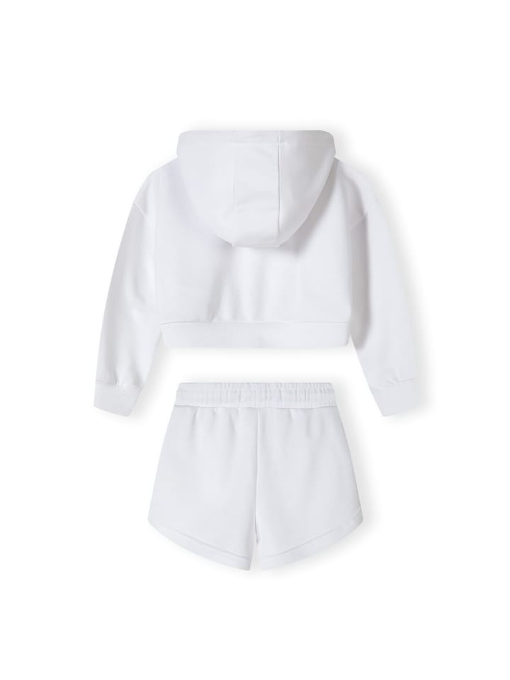 Комплект из легкого трикотажного полотна с добавлением хлопка. Толстовка с застежкой-молнией, капюшоном и принтом, рукава и подол с ребристыми манжетами. Шорты с закругленными краями, карманами и эластичным поясом со шнурком. - Комплект из легкой трикотажной ткани с добавлением хлопка.