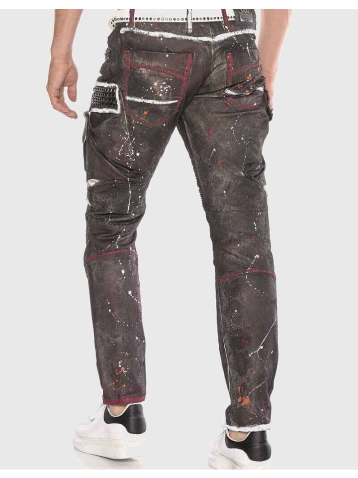 Мужские джинсы Cipo \u0026 Baxx CD636 отличаются высоким качеством и очень удобны в носке благодаря низкому содержанию эластана. Данная модель является одной из самых ярких во всем ассортименте продукции бренда Cipo & Baxx. Цвет джинсов — бордовый. Он украшен заклепками и брызгами цвета! Поверхность в ярком дизайне особенно впечатляет. Модель прямого кроя и свободно сидит на теле. Изделие изготовлено из хлопка и эластана, обеспечивает удобную посадку и идеальный комфорт при ношении. Великолепный акцент для простых футболок или рубашек. — Необычные мужские джинсы от Cipo Baxx