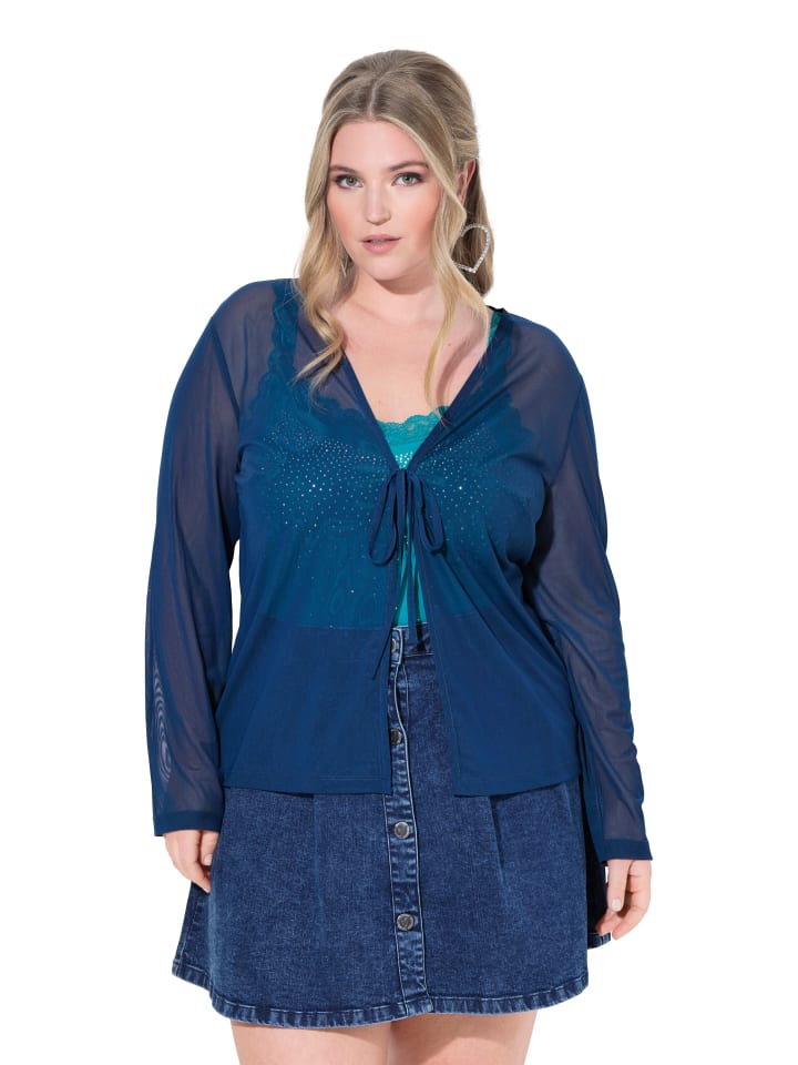 Сетчатый жакет А-силуэта из прозрачной сетки с V-образным вырезом и завязывающимся поясом. Длинные рукава.