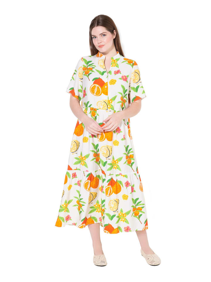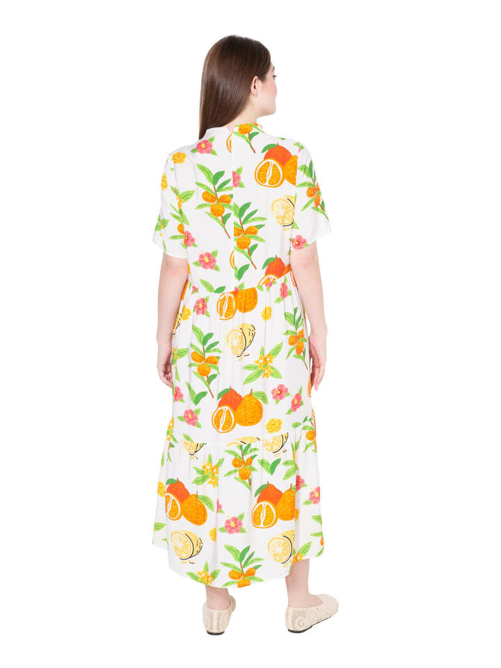 Платье макси, А-силуэта, из мягкой вискозы с принтом по всей поверхности. Воротник-бокал с V-образным вырезом и планкой на пуговицах, короткие рукава. Широкий волан по подолу.