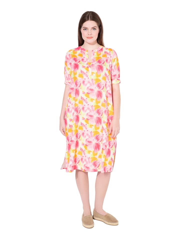 Платье-туника прямого покроя из льняной смеси с натуральным прохладным льном и красочным цветочным узором. Небольшой воротник-стойка с V-образным вырезом, короткие рукава с разрезом, длинные разрезы по бокам для еще большего комфорта.