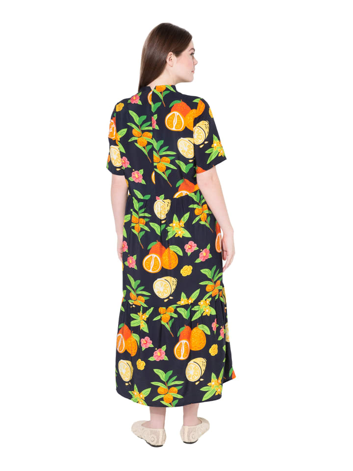 Платье макси, А-силуэта, из мягкой вискозы с принтом по всей поверхности. Воротник-бокал с V-образным вырезом и планкой на пуговицах, короткие рукава. Широкий волан по подолу.