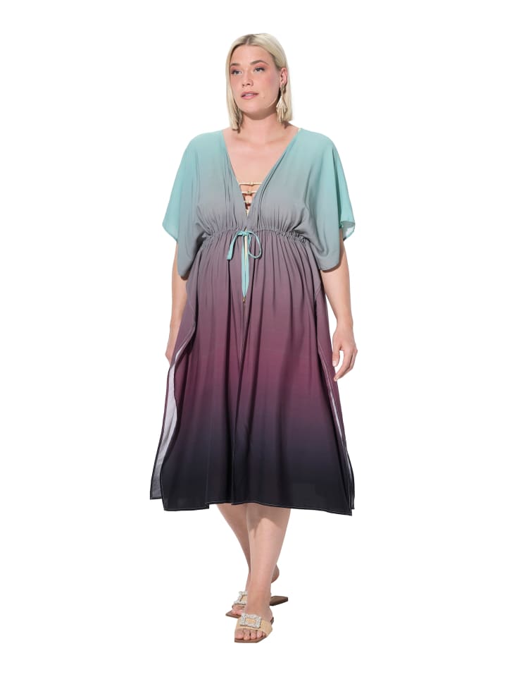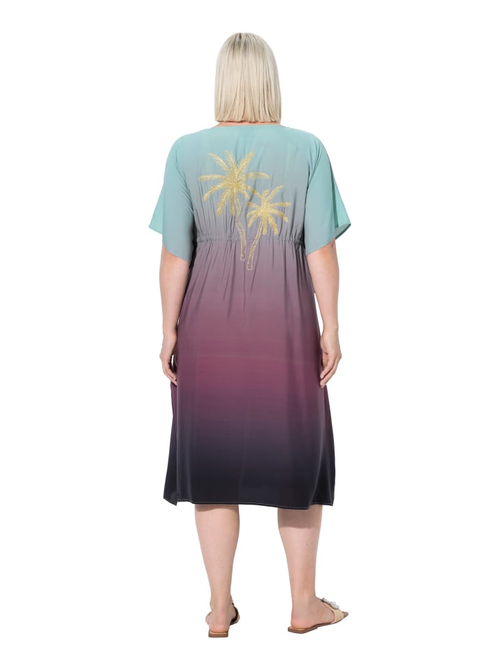 Кафтан, широкий, с цветовым переходом и пальмами на спине. V-образный вырез, завязка на талии. Длинные боковые разрезы.