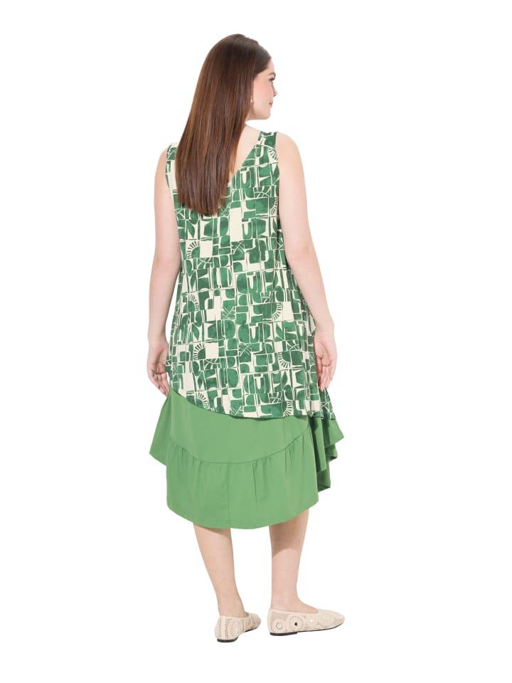 Платье миди из органического хлопка, двухслойное. Платье А-силуэта без рукавов с удобными широкими бретелями. Верхний слой с узором и асимметричным подолом. Нижняя часть однотонная с заметной оборкой по подолу. V-образный вырез, сборка на бретелях. Органический; сертифицирован ECOCERT Greenlife Лицензия №. 152026.