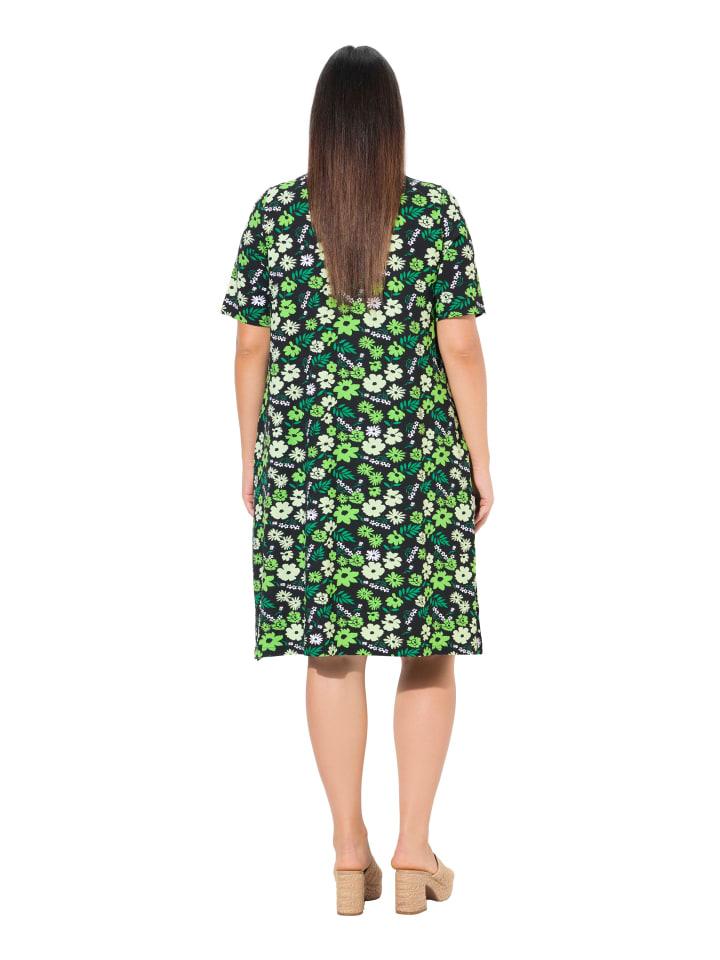 Трикотажное платье А-силуэта из комфортного эластичного трикотажа с цветочным узором. V-образный вырез с застежкой на пуговицу и декоративной складкой, карманы в боковых швах, короткие рукава. Боковые разрезы для еще большего комфорта.