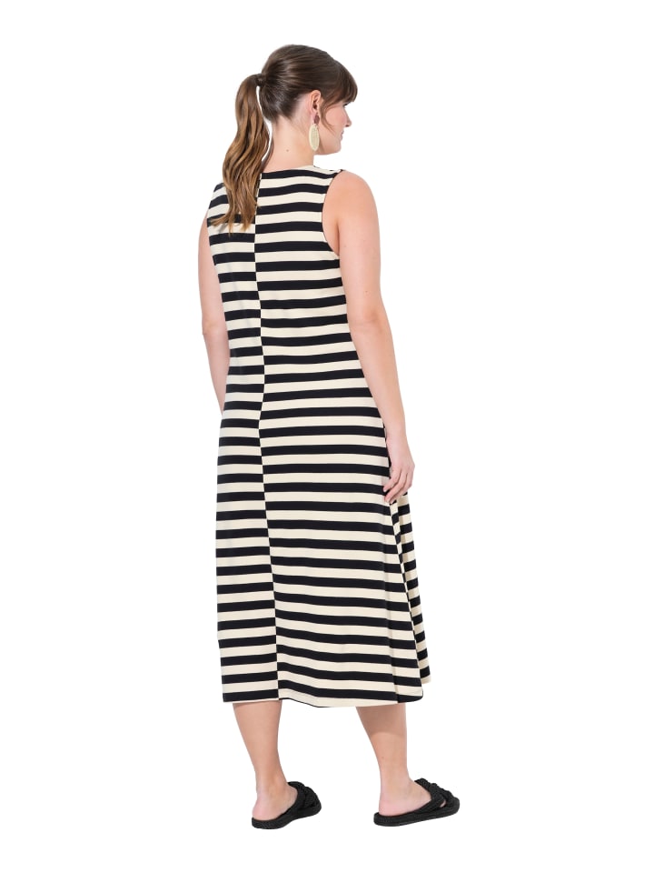 Трикотажное платье-миди из органического хлопка, высококачественный трикотаж интерлок с полосками, смещенными спереди - привлекающий внимание элемент. Платье А-силуэта без рукавов с округлым V-образным вырезом. Боковые разрезы для плавного падения. Органический; сертифицирован ECOCERT Greenlife Лицензия №. 152026.