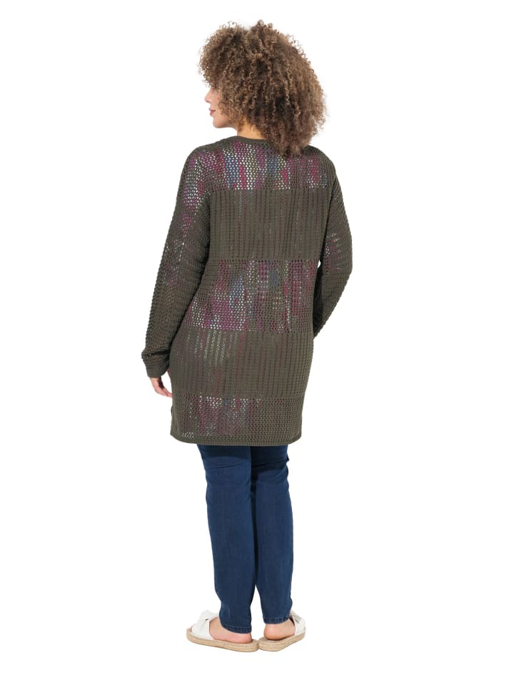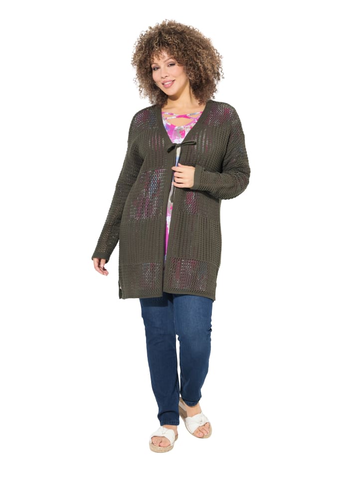 Кардиган оверсайз из прозрачной ажурной вязки с широкими полосками. V-образный вырез с завязкой, спущенная линия плеча, длинные рукава.