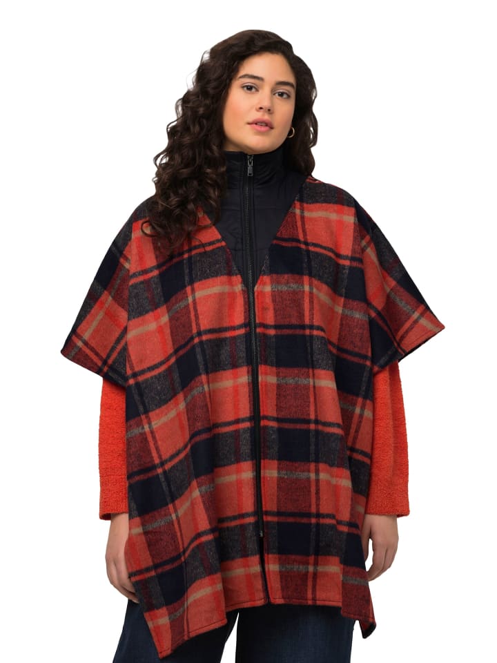 Пончо, широкое, свободного покроя, в цветную клетку. Изюминка: воротник-тройер декоративного цвета с застежкой-молнией. Открытые боковые швы с застежкой-кнопкой.