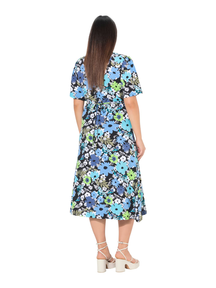 Трикотажное платье-миди А-силуэта из приятного на ощупь трикотажа с тонкой структурой и цветочным узором. Изюминка: эластичный декоративный шов. V-образный вырез, широкие рукава-половинки.