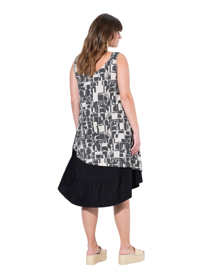 Платье из органического хлопкового джерси с многослойным дизайном без рукавов — верхний слой с абстрактным принтом в виде солнца и асимметричным подолом. Ниже — удлиненное платье с широким воланом по подолу. Удобные широкие бретели и V-образный вырез. Органический; сертифицирован ECOCERT Greenlife Лицензия №. 152026.