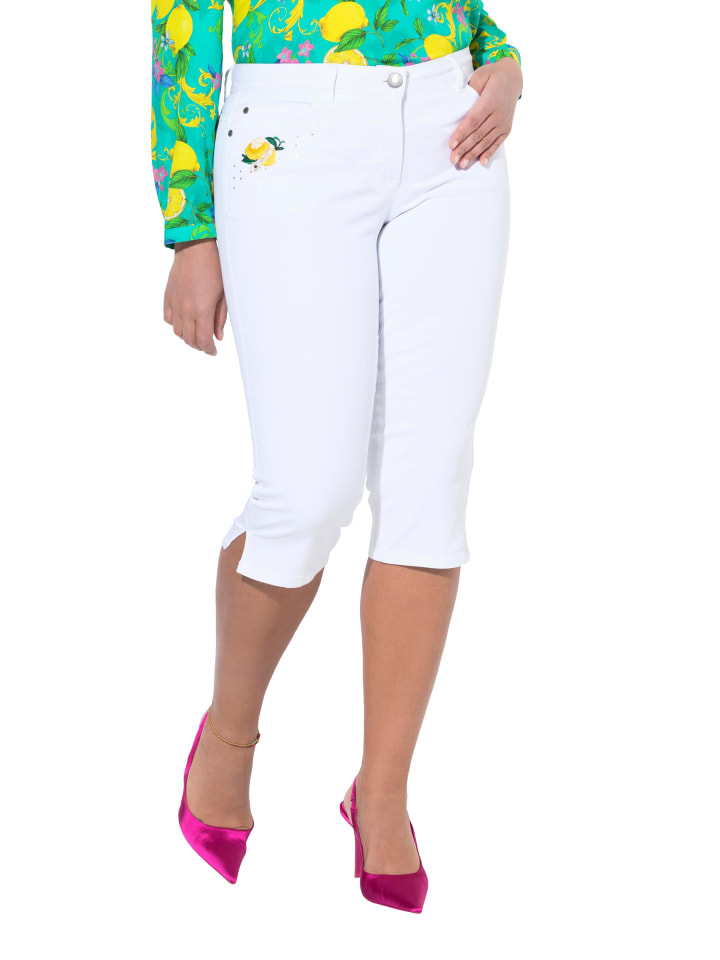 Джинсы-капри Carrie 3/4 из эластичной ткани с короткими разрезами по низу. Вышивка лимонного цвета с блестящими камнями на правом кармане. Длина примерно до икры, пять карманов, пояс со шлевками, застежка на пуговицу и молнию.