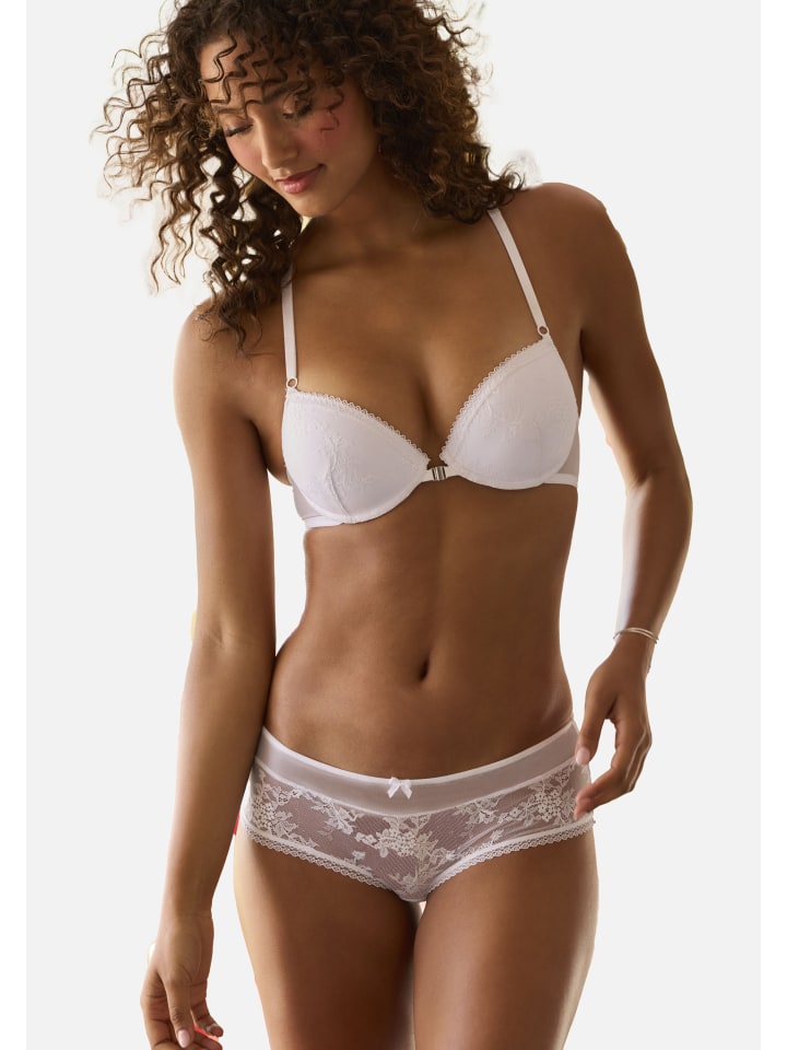 Женственные трусики с изящным декоративным бантом по центру спереди. Изготовлено из тонкого прозрачного жаккардового кружева. С интегрированной хлопковой ластовицей. Доступен соответствующий бюстгальтер из той же серии. Создано с любовью и страстью в Гамбурге. Изготовлено из 88% полиамида, 12% эластана.