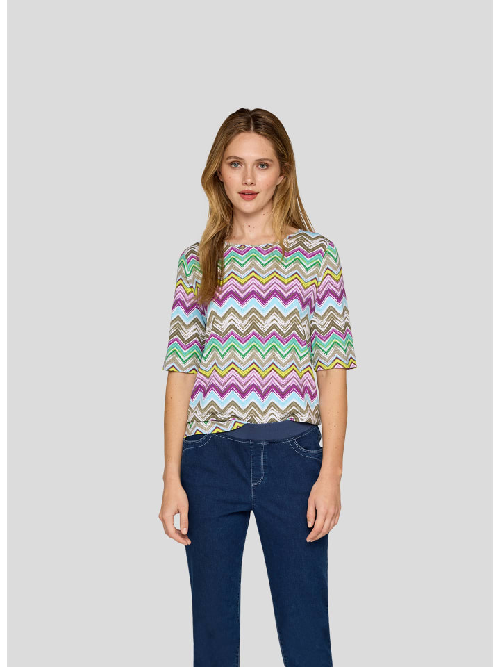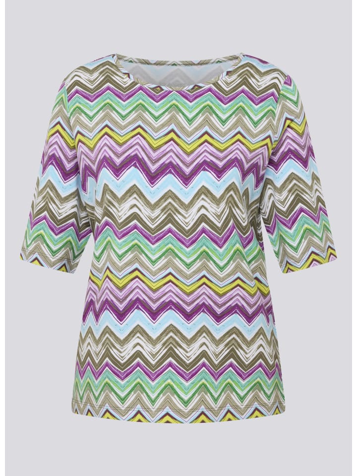 Гармоничное сочетание оттенков зеленого, фиолетового и синего делает этот топ по-настоящему притягивающим взгляды. Классический круглый вырез и рукава средней длины обеспечивают удобную посадку. Эффектный зигзагообразный узор для модного образа. Приятный, мягкий материал для максимального комфорта. Короткие рукава и удобная посадка — идеальный вариант для повседневной носки. Идеально подходит для создания свежего, модного образа — как для отдыха, так и для работы в офисе! - Рубашка с цветным зигзагообразным узором
