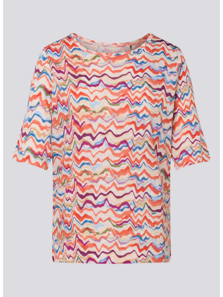 Классический круглый вырез и рукава средней длины придают изделию вневременной силуэт, а красочный принт делает его по-настоящему притягивающим взгляды. Идеально подходит для женщин, которые хотят придать своему повседневному образу нотку индивидуальности и легкости. Выразительный зигзагообразный узор – современный и игривый. Удобные рукава полудлины. Мягкий, удобный материал для максимального комфорта. Идеально сочетается с джинсами, юбками или легкими брюками. По-настоящему эффектная вещь для весны и лета. - Модная рубашка с ярким зигзагообразным узором