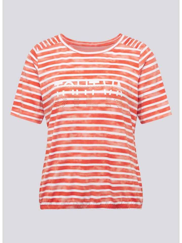 Изящные сборки на плечах добавляют изысканный акцент и придают рубашке женственность. Идеальная повседневная вещь с модной ноткой! Классический полосатый узор с модным принтом спереди. Изящные сборки на плечах. Круглый вырез для классической посадки. Удобный крой — идеально подходит для повседневной носки. Прекрасно сочетается с джинсами или простыми брюками. - Полосатая рубашка с модным принтом спереди и сборками