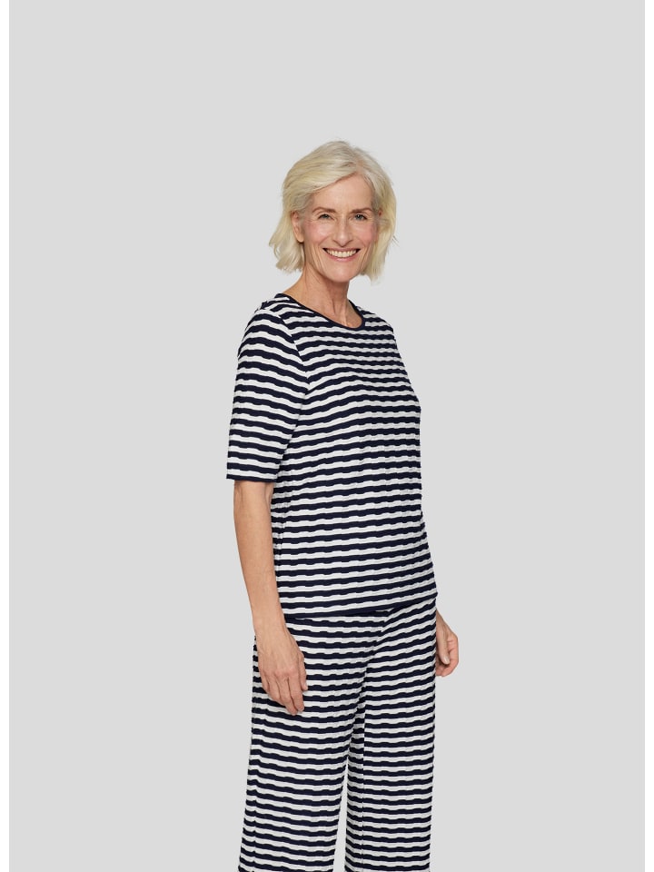 Особая структура материала придает рубашке не только визуальную глубину, но и интересные тактильные ощущения. Рукава средней длины и удобный круглый вырез горловины — идеальный выбор для стильных повседневных образов. Структурированная ткань для особого вида и комфорта. Классический полосатый дизайн темно-синего белого цвета. Короткие рукава и круглая горловина для удобной посадки. Универсальные сочетания — морские, спортивные или элегантные.