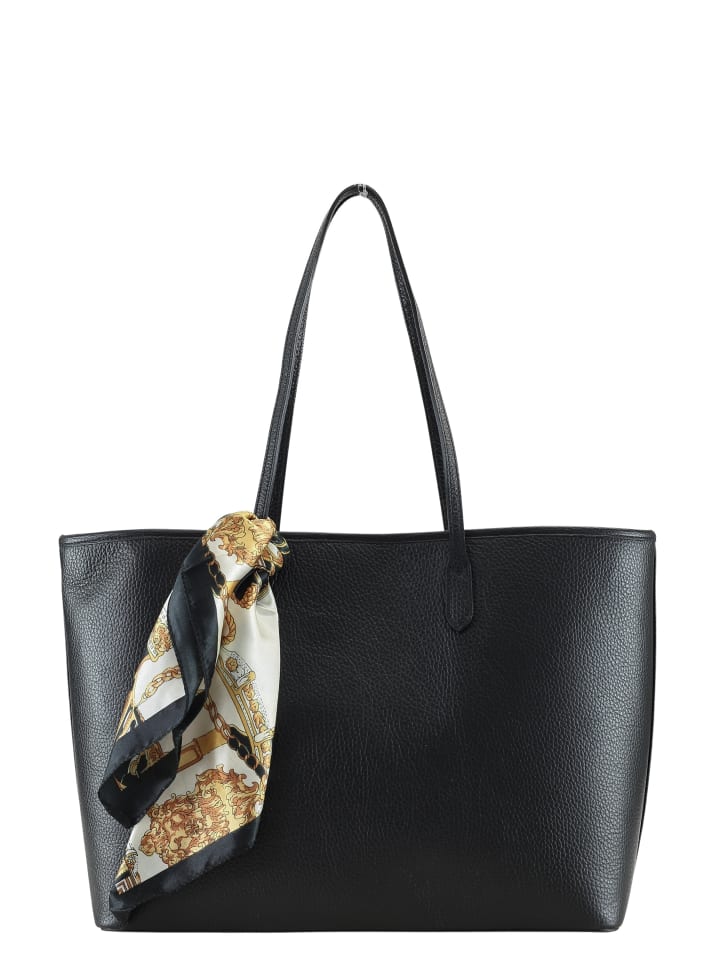 Эта вместительная сумка-шоппер — идеальный универсальный вариант для стильных женщин, которые не хотят отказываться от элегантности в повседневной жизни. Изготовленный в Италии из высококачественной зернистой кожи, он не только вместителен, но и имеет нечто особенное: съемную декоративную ткань, свободно привязанную к ручке, что придает простому дизайну нотку роскоши и модную изюминку. Длинная ручка позволяет удобно носить сумку-шоппер на плече — даже вместе с пальто или пиджаком. Вместительное внутреннее пространство тщательно продумано: отделение на молнии и два накладных кармана для мобильного телефона, ключей или помады. Сумка надежно застегивается на молнию и остается абсолютно вне времени благодаря своей четкой, лаконичной форме. Будь то классический черный или ярко-оранжевый цвет — эта сумка-шоппер станет стильным спутником в офисе, за покупками или на выходных. И самое приятное: декоративный шарф можно снять и носить по-другому — например, как повязку на волосы или на шее. Это делает сумку универсальной и стильной одновременно. - Натуральная кожа