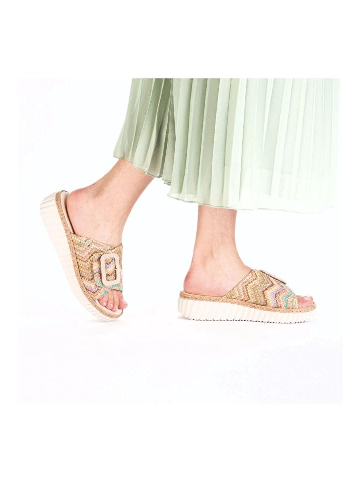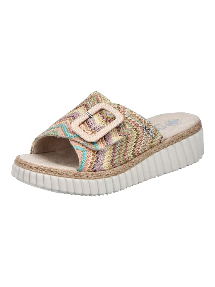 Модные и удобные мюли от Rieker из дышащего текстиля. Красивый ремешок с красивой декоративной пряжкой можно легко подогнать под форму вашей ноги с помощью застежки-липучки. Мягкая стелька и удобная высота танкетки обеспечивают чрезвычайно высокий комфорт. - Застежка: липучка