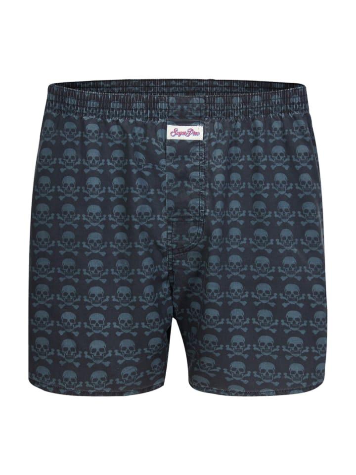 Боксеры-шорты Sugar Pine \"Skulls\" - эти классические боксеры сочетают в себе необычный стиль и высокое качество продукции: мягкий хлопок приятно ощущается на коже, а шорты имеют широкий и удобный крой. Разрезы по бокам штанины обеспечивают большую свободу движений, а эластичный пояс гарантирует удобную посадку. Спереди имеется скрытое отверстие. Коллекция «Dry Aged» отличается особой технологией стирки, которая делает ткань особенно мягкой и придает мотивам уникальный винтажный эффект. Эта специальная стирка делает каждую пару трусов-боксеров уникальной! - В винтажном стиле