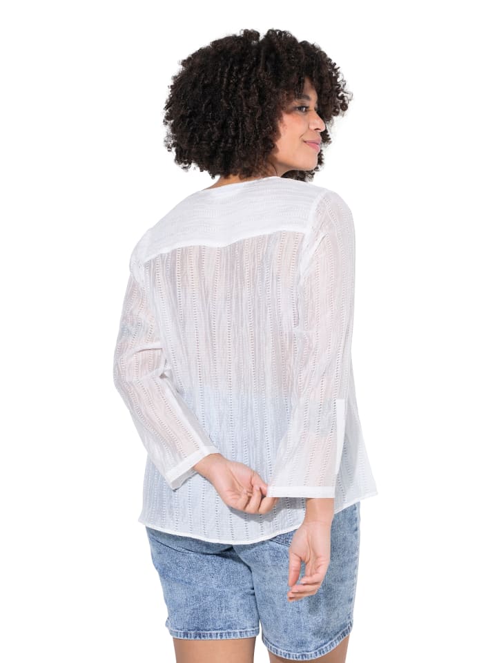 Блузка удобного кроя, выполнена из очень легкого хлопка. Туниковый вырез с застежкой на пуговицы, длинные рукава, удлиненный подол сзади.
