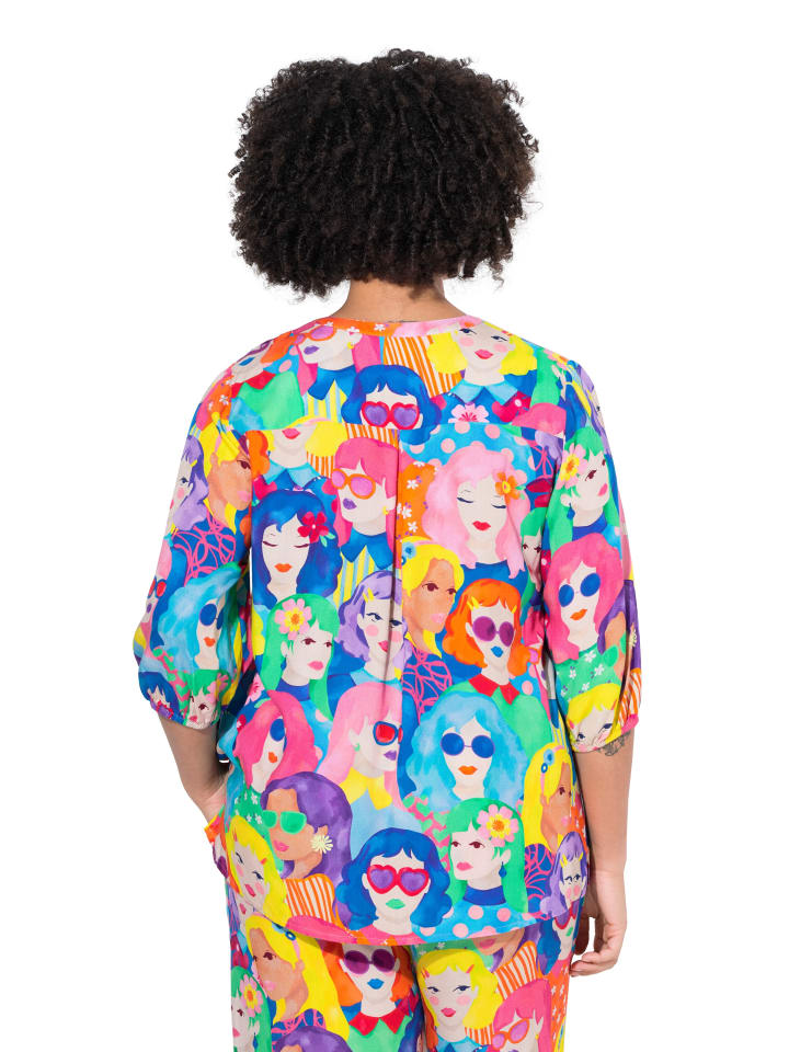 Блузка А-силуэта из мягкой вискозы с рисунком в виде лица. Вырез горловины туника, застежка на пуговицы, рукава 3/4 с эластичными манжетами. Боковые разрезы