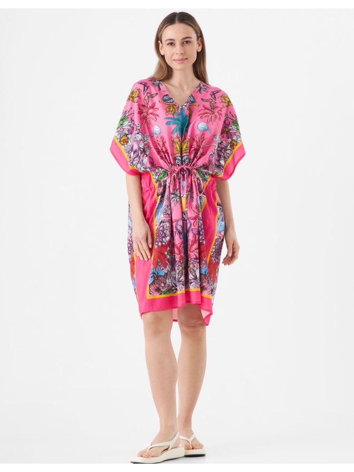С пляжа прямиком в бар? Это работает. Просто наденьте нашу воздушную тунику с экзотическим узором джунглей поверх бикини, добавьте стильную пляжную сумку и шикарные сандалии — ваш образ готов. Туника выполнена из вискозы, имеет V-образный вырез и регулируется по талии с помощью шнурка. Вискоза нежная и мягкая, струится и имеет красивый матовый блеск. - Размер: 81 x 98 см