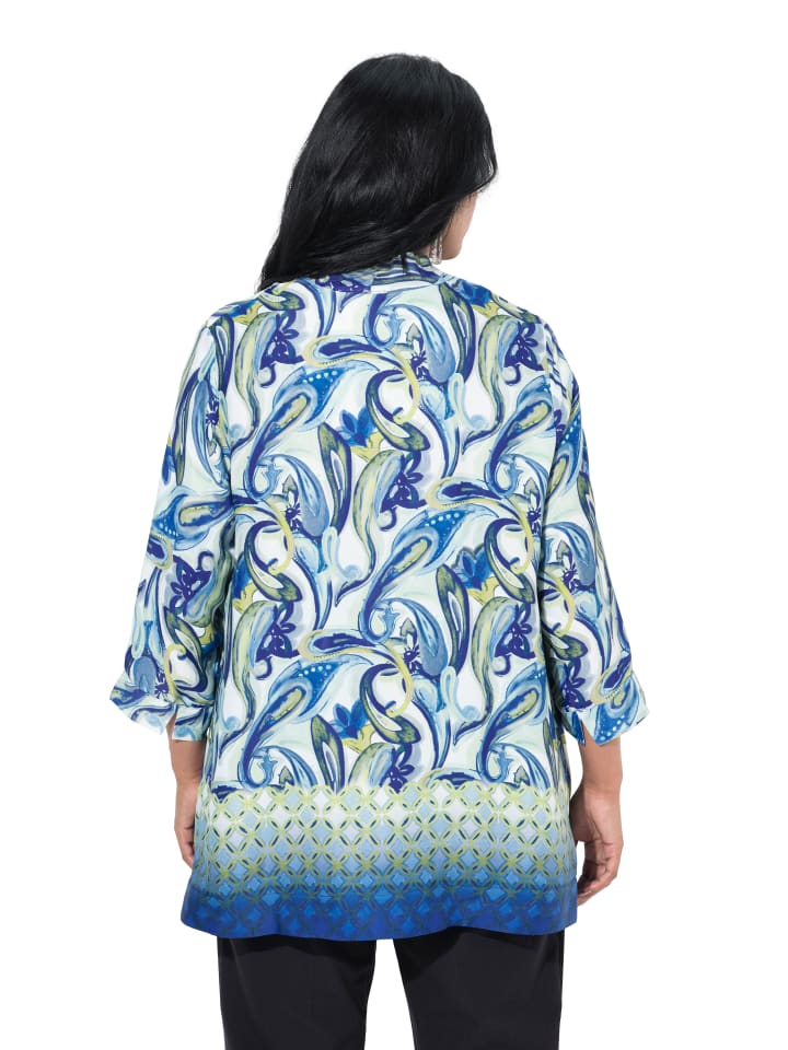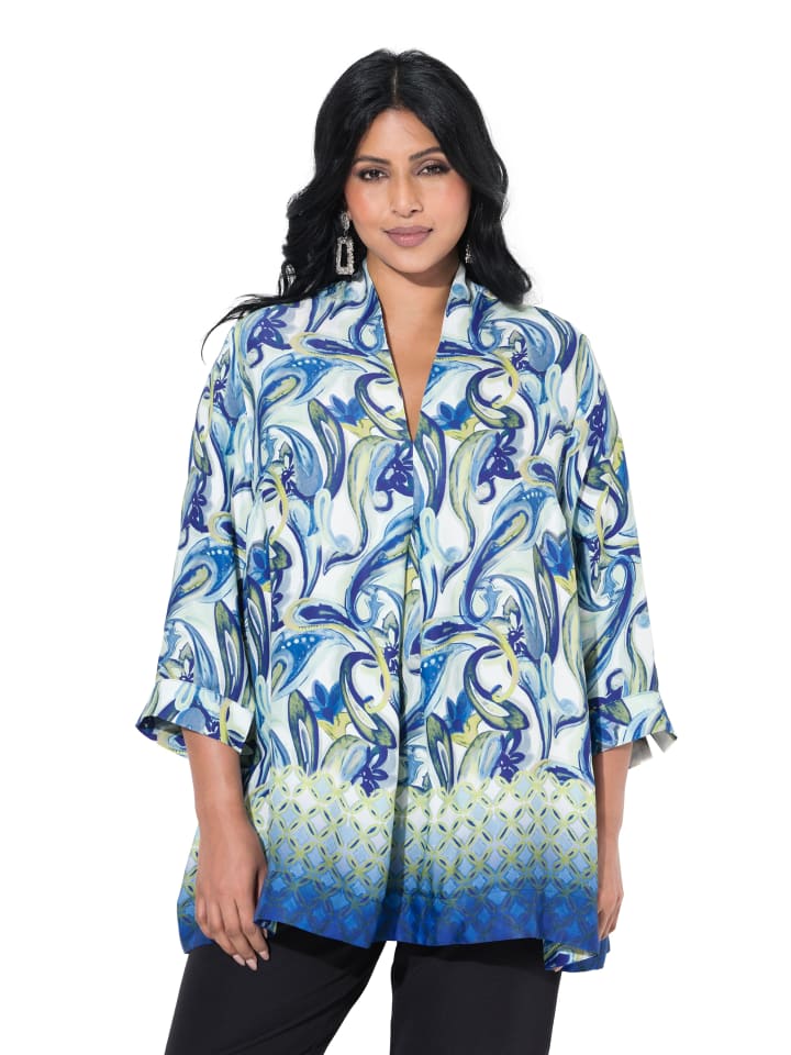 Туника удлиненного А-силуэта из мягкой вискозы с современным узором пейсли и узорчатой каймой по подолу. Воротник-бокал с V-образным вырезом и декоративной складкой, рукава 3/4 с разрезом. Удобная ширина подола.