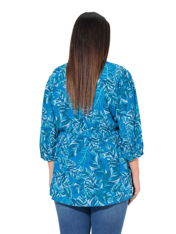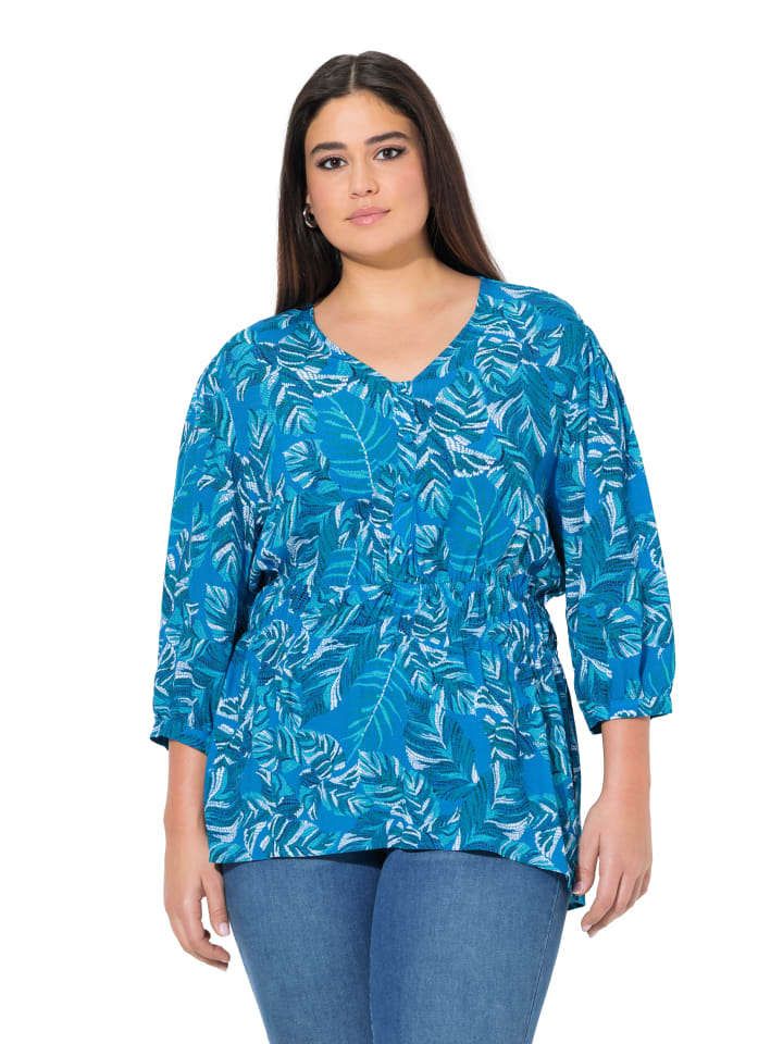 Блузка А-силуэта из мягкого крепа с узором в виде листьев. V-образный вырез с застежкой на пуговицы, эластичный пояс — еще удобнее в носке. Рукава 3/4 с манжетами, закругленный подол, удлиненная спинка.