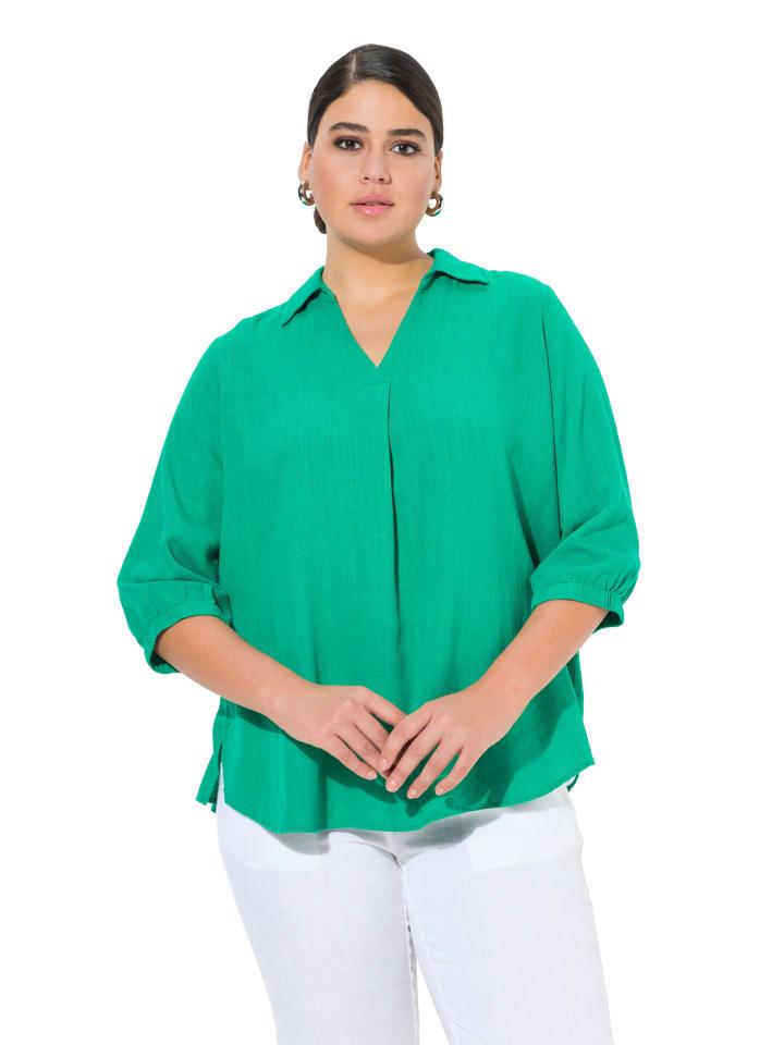 Туника А-силуэта из смесового льна, выполненная из натуральной прохладной и гладкой льняной смеси. Воротник рубашки с V-образным вырезом, рукава 3/4 с эластичными манжетами. Закругленный подол с разрезами по бокам.