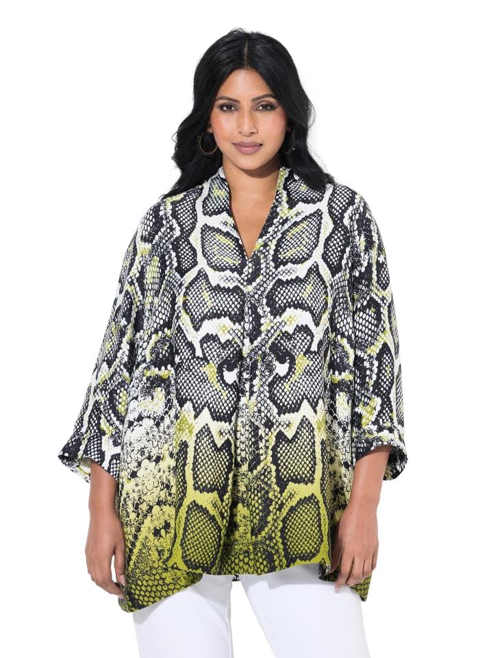 Туника удлиненного А-силуэта из мягкой вискозы с узором «змея» и градиентным подолом. Воротник-бокал с V-образным вырезом и декоративной складкой, рукава 3/4 с разрезом. Удобная ширина подола.