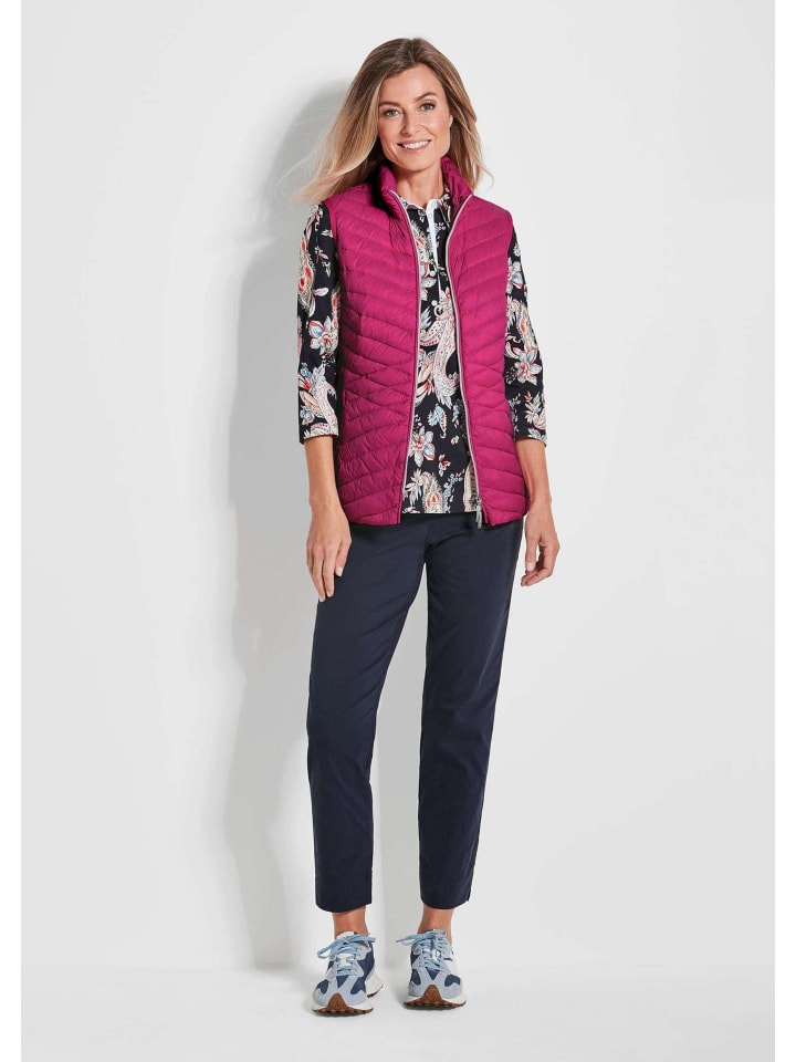 Стеганый жилет с настоящим пухом. Наполнитель из пуха и пера делает модель особенно легкой и при этом сохраняет тепло — идеальный вариант для переходного сезона или прохладных вечеров. Изысканная диагональная простежка на талии визуально стройнит. Карманы и проймы отделаны эластичной окантовкой. С практичной двухсторонней молнией. Ваша новая любимая модель, которая поражает своей легкостью и прочностью! Длина ок. Размер 69 см. 46, ок. 65 см в размере 23.