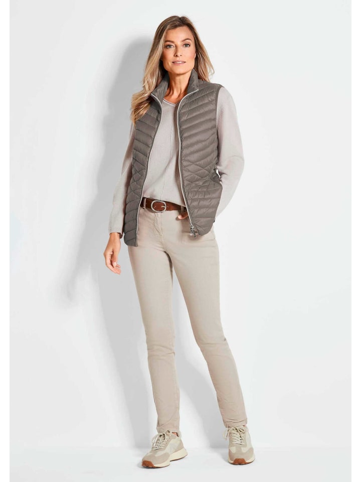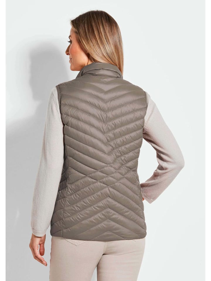 Стеганый жилет с настоящим пухом. Наполнитель из пуха и пера делает модель особенно легкой и при этом сохраняет тепло — идеальный вариант для переходного сезона или прохладных вечеров. Изысканная диагональная простежка на талии визуально стройнит. Карманы и проймы отделаны эластичной окантовкой. С практичной двухсторонней молнией. Ваша новая любимая модель, которая поражает своей легкостью и прочностью! Длина ок. Размер 69 см. 46, ок. 65 см в размере 23.