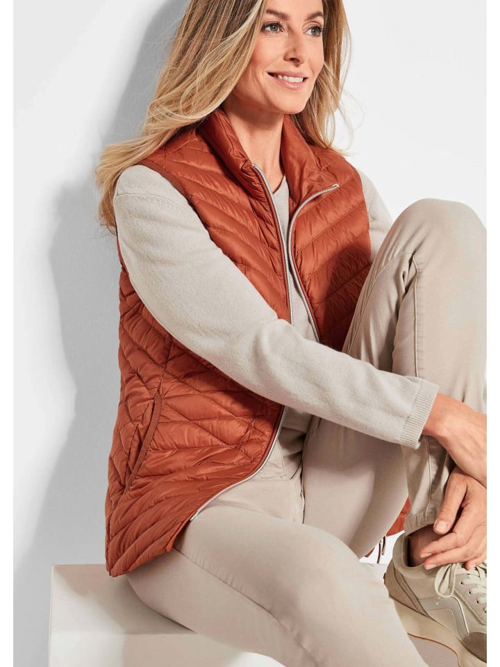 Стеганый жилет с настоящим пухом. Наполнитель из пуха и пера делает модель особенно легкой и при этом сохраняет тепло — идеальный вариант для переходного сезона или прохладных вечеров. Изысканная диагональная простежка на талии визуально стройнит. Карманы и проймы отделаны эластичной окантовкой. С практичной двухсторонней молнией. Ваша новая любимая модель, которая поражает своей легкостью и прочностью! Длина ок. Размер 69 см. 46, ок. 65 см в размере 23.