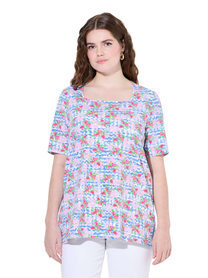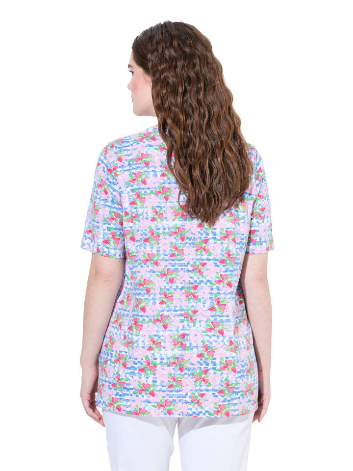 Футболка классического кроя из комфортного эластичного трикотажа с рисунком в виде клубники. Квадратный вырез, короткие рукава. Боковые разрезы — еще удобнее.